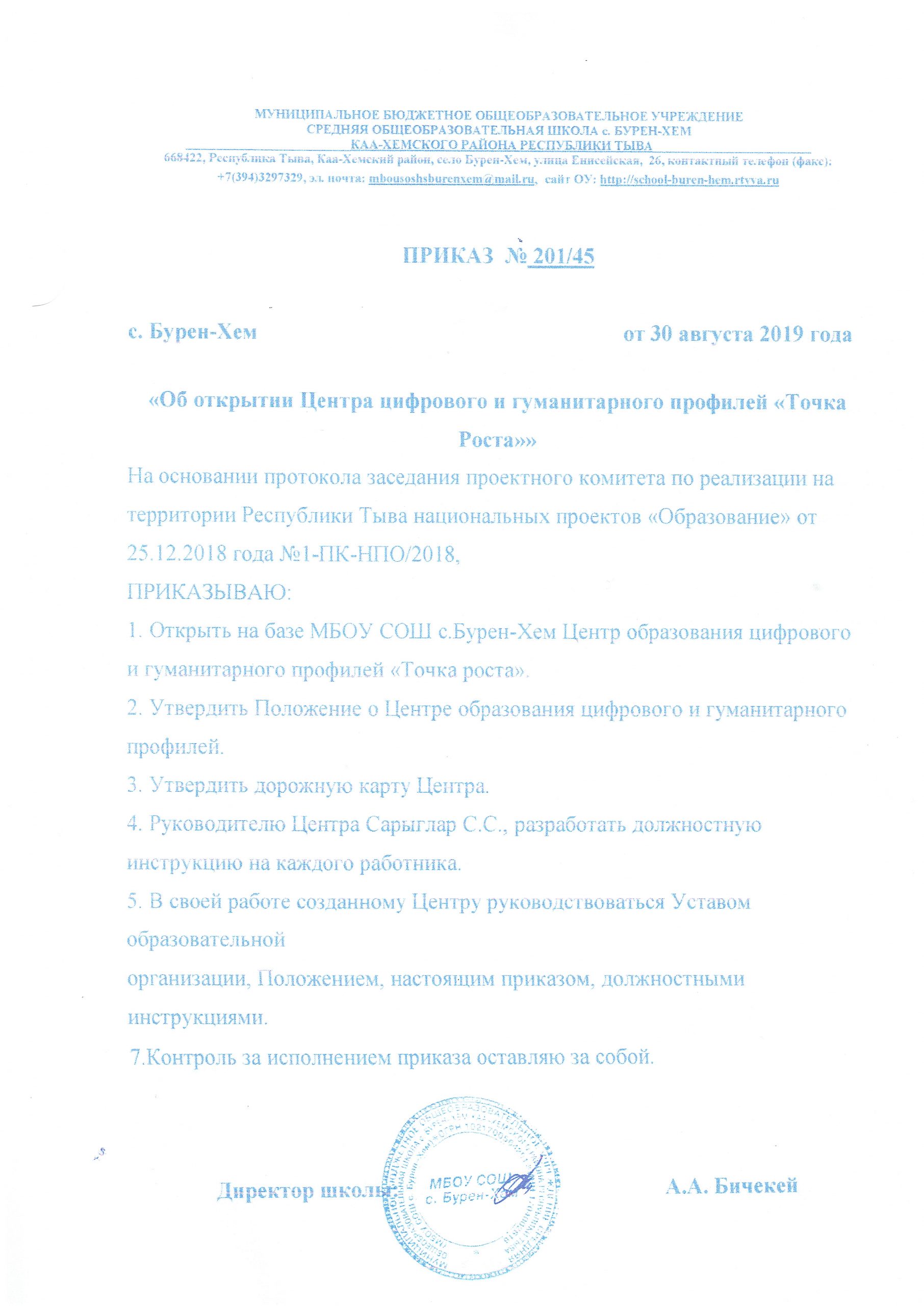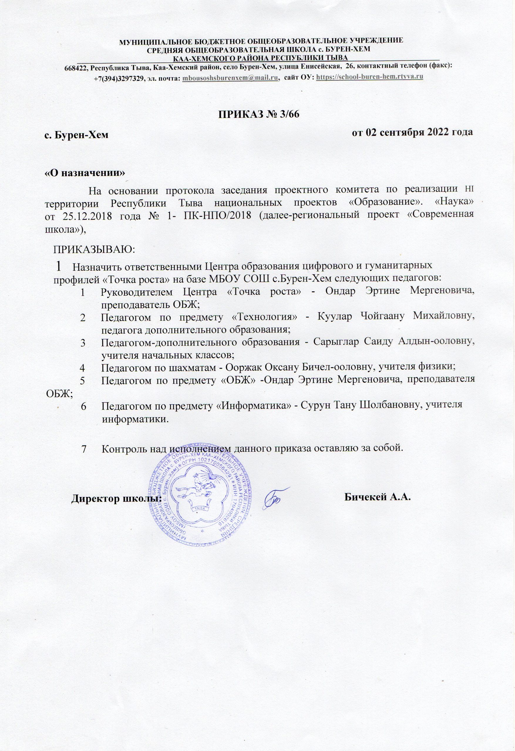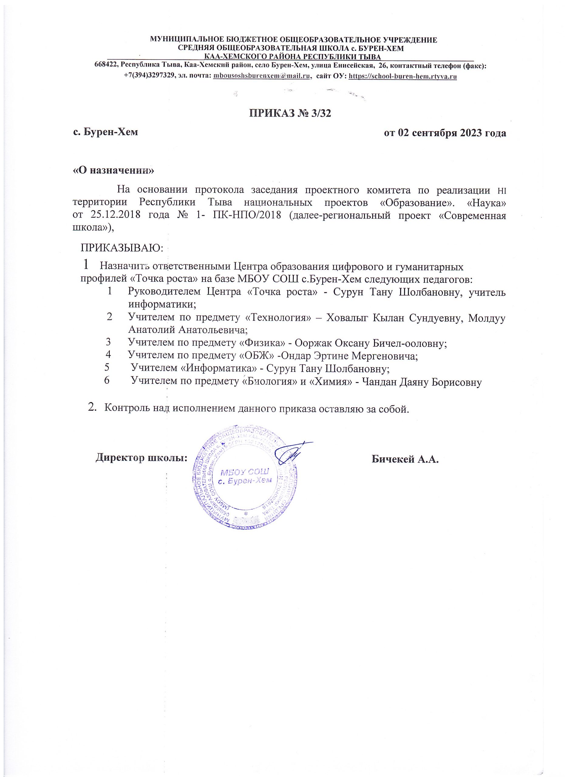 Документация Распоряжение Минпросвещения России от 12.01.2021 г. № Р-6 «Об утверждении Методических рекомендаций по созданию и функционированию в общеобразовательных организациях, расположенных в сельской местности и малых городах, центров образования естественно-научной и технологической направленностей» 2. Приказ об открытии Центра цифрового и гуманитарного профилей «Точка Роста» 3. Положение о деятельности Центра образования цифрового и гуманитарного профилей «Точка роста» при МБОУ СОШ с.Бурен-Хем 4. Приказ №3/66 от 02.09.2022г. О назначении 5. Приказ №3/32 от 02.09.2023 г. О назначенииСкачать 6. расписание-занятийСкачать