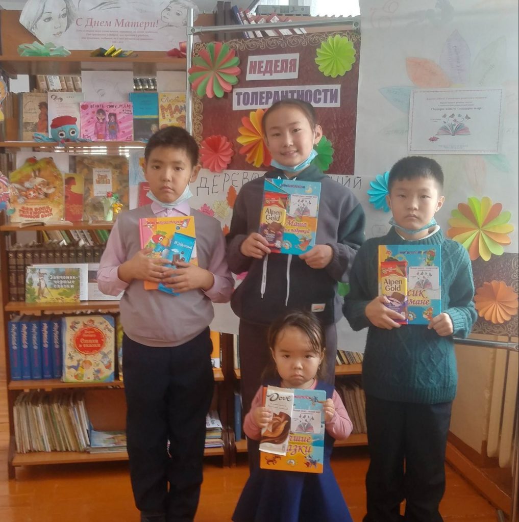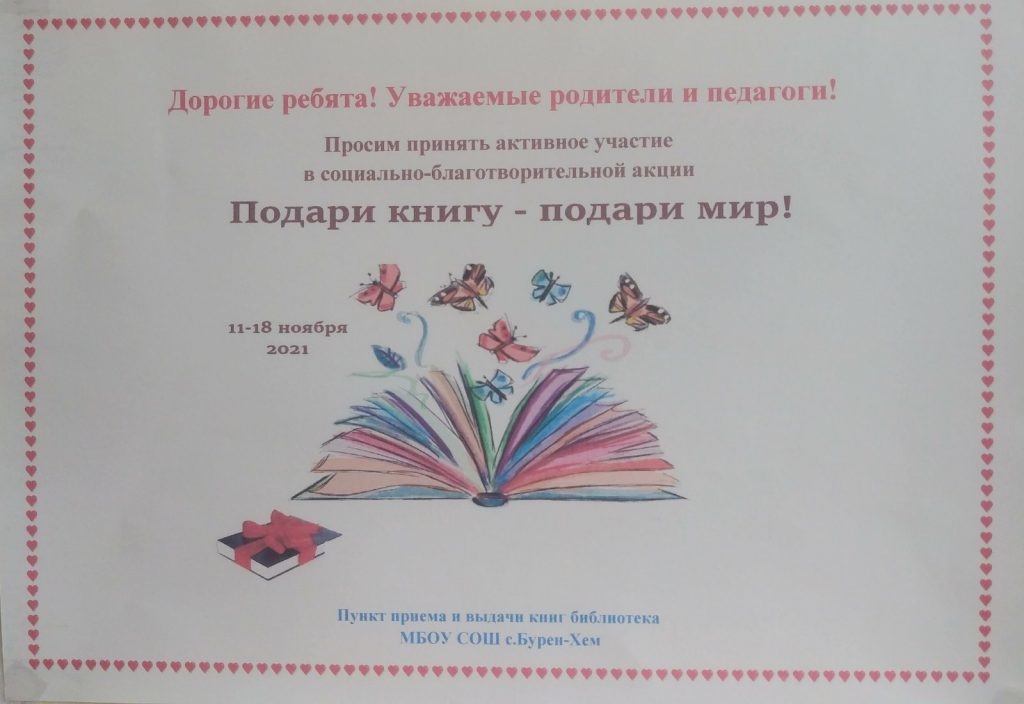 В библиотеке МБОУ СОШ с. Бурен-Хем 16 ноября 2021 года проводилось вручение подарков — книг, собранных по социально-благотворительной акции «Подари книгу — подари мир!», во время которой все желающие могли принести книги в пункт приёма, школьную библиотеку.